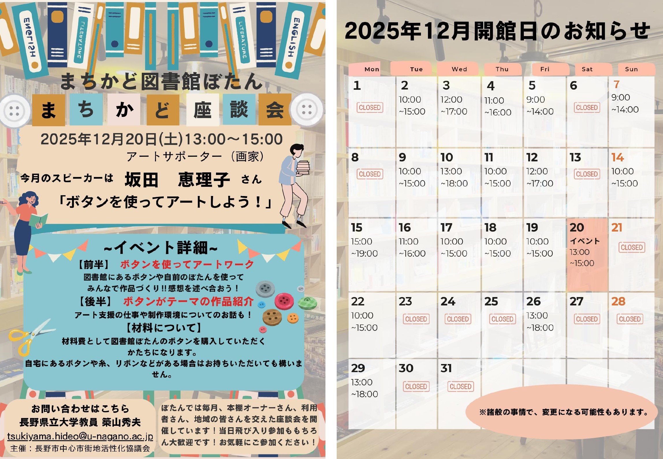 | 内容 | 開館から2年目に入った長野駅前北石堂町にある『まちかど図書館ぼたん』。長野県立大学築山ゼミが中心となり、ゼミ生達が図書館の店番をしながら運営しております。これからもぜひ沢山の方にお越しいただければと思います!まちかど図書館ぼたんでは、毎月、本棚オーナーさん、利用者さん、地域の皆さんを交えた座談会を開催しています! 第13回目となる今年最後の12月の“まちかど座談会”は、本棚オーナー様でアートサポーター(画家)の坂田恵理子さんが、<ボタンを使ってアートしよう!>と題して、アートワーク座談会を開催いたします! ★★★イベント詳細★★★ 【前半】 ボタンを使ってアートワーク ◆図書館にあるボタンや自前のぼたんを使ってみんなで作品づくり!!感想を述べ合おう! 【後半】 ボタンがテーマの作品紹介 ◆アート支援の仕事や制作環境についてのお話も! ※【材料について】 ◆材料費としてまちかど図書館ぼたんのボタンを購入していただくかたちになります。自宅にあるボタンや糸、リボンなどがある場合はお持ちいただいても構いません。 当日飛び入り参加ももちろん大歓迎です!お気軽にご参加ください! 皆さんで色んな話をして繋がり、一緒に楽しみましょう♪♪ 詳しくは、 ■Instagram『まちかど図書館ぼたん』 https://www.instagram.com/botan_bond/ 株式会社まちづくり長野のホームページ(お知らせ欄)からもご覧いただけます。 ↓↓↓ https://www.machidukuri-nagano.jp/news/2025/12/03/4907/ |