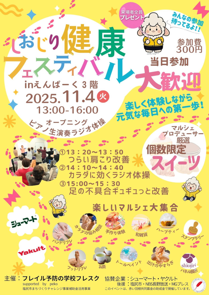 | 内容 | 健康づくりの第一歩を応援! 地域の皆さまが気軽に健康づくりを始められるよう、「フレイル予防の学校」で実施している健康講座のショート版を3種類ご用意。普段講座に参加されていない方も、体験を通じて自分の健康と向き合うきっかけになります。 当日は、ヤクルト・シューマートの協力による体験ブースをや健康に関わる出店者の協力のもと、健康の“見える化”を通じて、身体や生活習慣を見直す機会を提供します。 さらに、イベント全体を楽しみながら回遊できるスタンプラリーを実施。地域の憩いの場として、飲食・物販ブースも設け、参加者がゆったりと過ごせる空間をご用意しています。 |