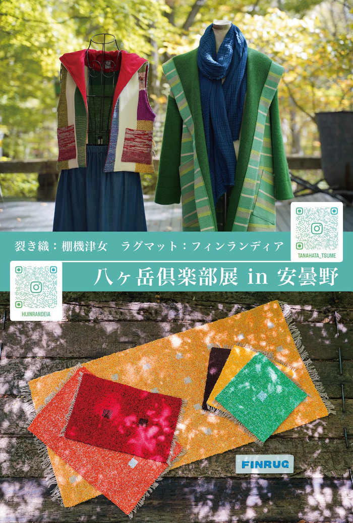 内容 山梨県北杜市標高1360mの森の中でカフェ・レストランやショップ、展示会場が点在する八ヶ岳俱楽部から毎日をもっと好きになる作家作品&雑貨を厳選して展示販売いたします。裂織作家の棚機津女さんによるおしゃれな羽織り物やバッグ・小物作品。フィンランディアさんによるフィンランド伝統技法の織機で作られた丈夫なラグマット・フィンランドの原種の羊毛を使ったマフラーなど。