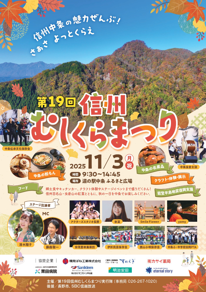 内容 今年も、郷土食おぶっこやおやき美味しいグルメがいっぱい!天然きのこの販売やクラフト体験、豪華なステージイベントなど盛りだくさん!1年を通して長野市中条地区では一番盛り上がるお祭りです!今年も見て、聴いて、元気になれるステージイベントが満載!虫倉太鼓の迫力のステージやダンス、歌のパフォーマンスや吹奏楽も登場!信州百名山・虫倉山の紅葉とともに秋の一日をみんなで楽しめます。ぜひ、お友達やご家族そろってお越しください。