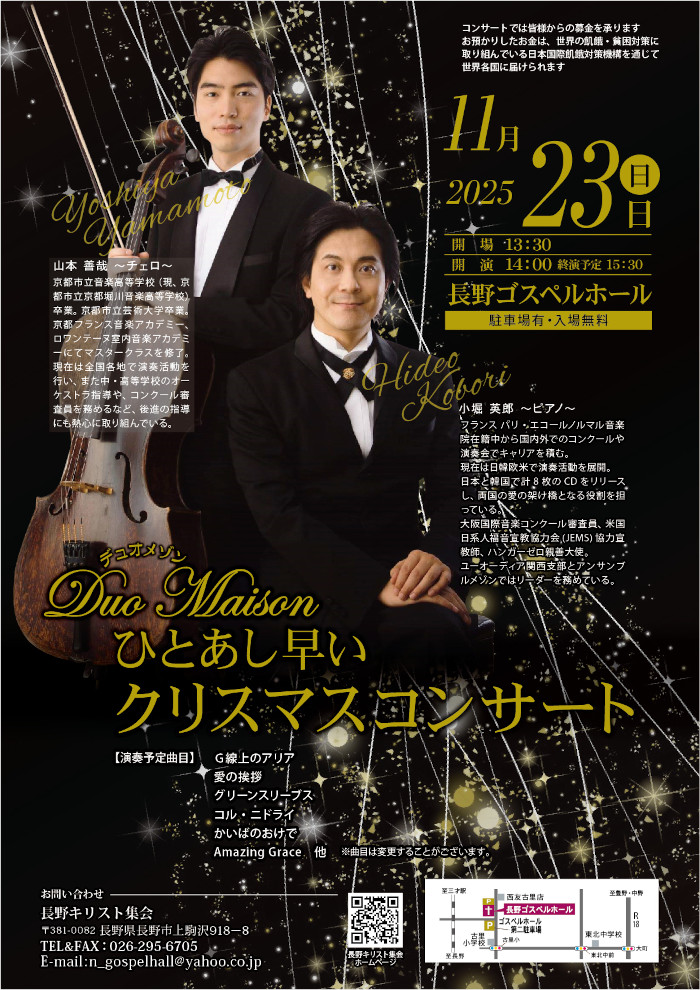 演奏予定曲:G線上のアリア、愛の挨拶、グリーンスリーブス、コル・ニドライ、かいばのおけで、Amazingu Grace 他