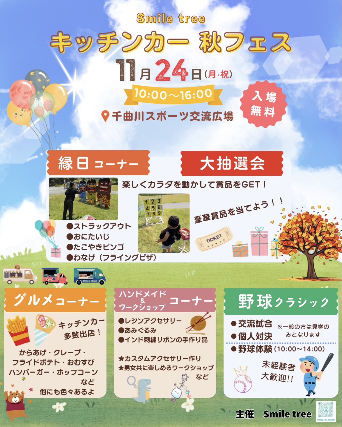 | 内容 | 人気のキッチンカーやフードテントが並び、できたてのグルメやスイーツを楽しめる。 会場には親子で楽しめる縁日もあり、笑顔あふれる一日を過ごせます。 詳細は、@smile_tree_naganoをご覧下さい |