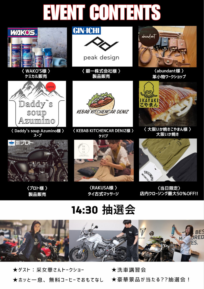 | 内容 | ・Free Coffee(無料コーヒーご提供) ・13:00 采女華さんトークショー ・バイク洗車講習会 ・14:30~豪華賞品抽選会 ・WAKO'Sケミカル販売 ・peak design 製品販売 ・シュアラスター洗車用品販売 ・プロト カスタム車輌展示、製品販売 ・革小物ワークショップ ・タイ古式マッサージ ・キッチンカー大阪いか焼きこやまん ・キッチンカーDaddy's soup Azumino ・キッチンカーDENIZケバブ ・当日限定、店内クロージング最大50%OFF バイク好きが集う特別なクリスマスイベントです。 入場自由 チラシを拡大する |