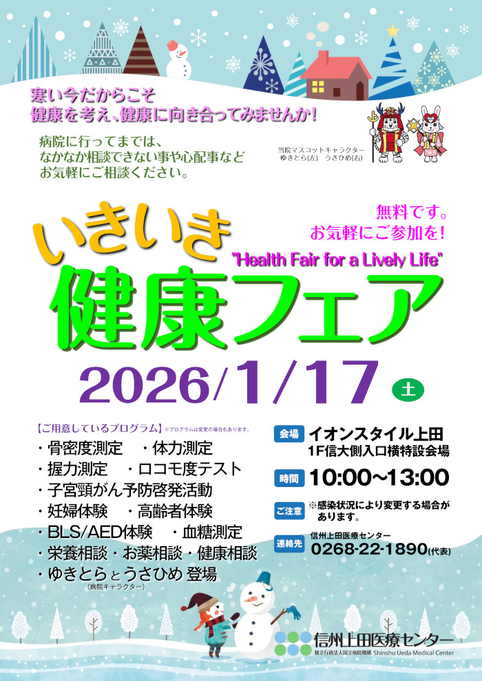 | 内容 | 信州上田医療センターは、2026年1月17日㈯「いきいき健康フェア2026」を、病院を飛び出してイオンスタイル上田・1階信大側入り口横特設会場で開催します。このイベントは、地域住民の方々の健康に対する意識の醸成・向上などを図ることを目的に開催します。病院で相談しづらい事や心配事などのご相談、がん相談、また、いつくかの健康チェックが体験できます。寒い今だからこそ健康を考え、健康に向き合う絶好のチャンスです。プログラムには、各種測定やテストをはじめ、妊婦の体験、高齢者の体験や、子宮頚がん予防の大切さを伝える啓発活動、私たちのことを知っていただく機会として、看護部の紹介動画、病院キャラクターとの記念撮影などもご用意し、ご家族連れで参加できる企画を構成しました。地域に開かれ皆様とともにある病院として、また、子どもたちが将来、医療職を志すきっかけとなることを願い、ご家族で楽しめる企画です。当院のコメディカルスタッフ、病院スタッフとともに、健康や医療のことを"体験して" "聞いて" "相談して考える"ひと時、お一人でもご家族でも是非ご参加していただこうと考えております。信州上田医療センターは、地域貢献活動の一環として、地域住民の皆様に寄り添ってまいります。 チラシを拡大する 【企画概要】 ・骨密度測定 ・体力測定 ・握力測定 ・ロコモ度テスト ・子宮頸がん予防啓発活動 ・妊婦体験 ・高齢者体験 ・BLS/AED体験 ・血糖測定 ・栄養相談(レシピ紹介と試食) ・お薬相談 ・健康相談 ・病院キャラクター”ゆきとら”と”うさひめ”記念撮影 等 |