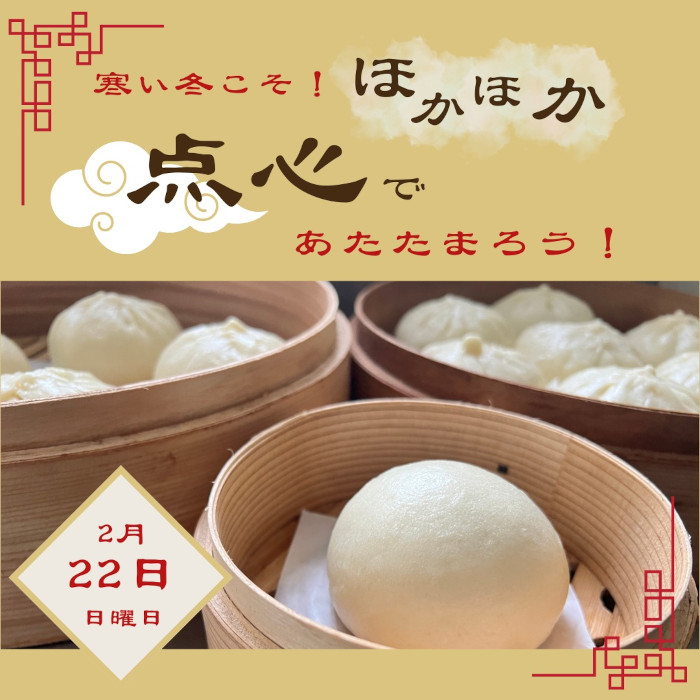 | 内容 | まだまだ寒い日が続くので…みんなで「点心」を包みながらほかほかとあたたまりませんか?一人で挑戦するとハードルの高い印象の点心も、みんなで作ったら楽しい体験に♪完成した点心はその場で熱々を食べても、お家に持ち帰ってもOK!今回は3つの点心メニューをご用意しました! ◆シュウマイ/12個 ◆あんまん/6個 ◆冰皮月餅/6個 ※各1500円 |