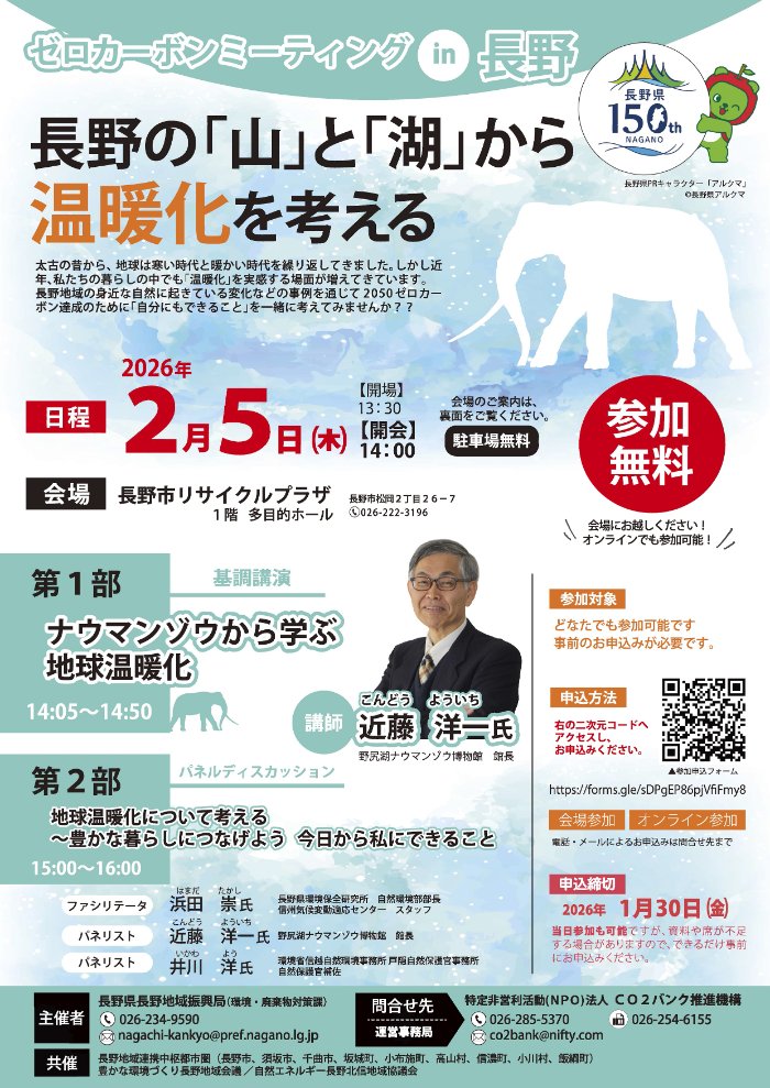 | 内容 | 長野の「山」と「湖」から温暖化を考えよう! 『ゼロカーボンミーティング in 長野』を開催します! 夏の猛暑、ゲリラ豪雨、水不足など・・暮らしの中でも「温暖化」を実感する場面が増えています。身近な自然に起きている変化などの事例を通じて、「自分にもできること」を一緒に考えてみませんか? 第1部 基調講演 『ナウマンゾウから学ぶ地球温暖化』 講師 野尻湖ナウマンゾウ博物館 館長 近藤洋一氏 第2部 パネルディスカッション 『地球温暖化について考える~豊かな暮らしにつなげよう 今日から私にできること』 詳しくはイベントのチラシをご覧ください。 |