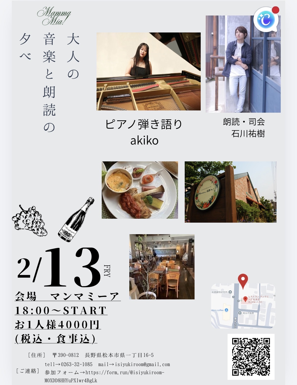 | 内容 | 大切な人とご一緒に、頑張っている自分へのご褒美に、音楽と朗読を愉しむディナー |