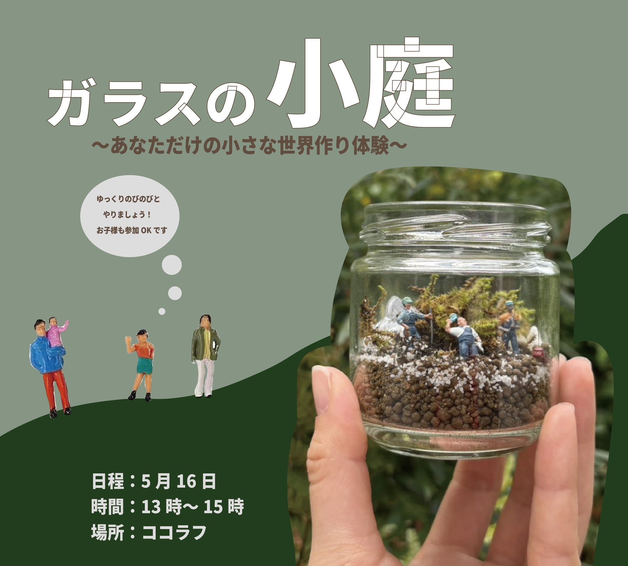 | 内容 | 飾って、癒される。あなただけの小さな世界を苔テラリウムの中に、詰め込んでみませんか? 人や車、家等の様々なミニチュアをはじめ、苔や砂も好きなものを好きなだけお取りいただけます。 それらを瓶に自由に詰めていき、自分だけの小さな世界を作りましょう。 初めての方も、お子様も大歓迎です!ゆっくりのびのびと作りましょう♩ |