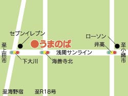 浅間サンライン沿いに今年4月オープンした、おしゃれな木目調のお店。いつかカフェをやりたいと思っていた店主の馬場代美さんが、自分の名前と「うまいものが楽しめる場に」という願いを掛け合わせて店名にしました。