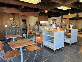 旧北国街道と国道141号が交わる「本町」交差点の角に、昨年12月にオープンしたカフェ。築100年以上の建物は、店主の大塚 拓(ひろむ)さんの祖母の実家で、かつては酒店だった。往時の雰囲気も残しつつ、カジュアルな空間に生まれ変わった。子どもと一緒に利用しやすい畳のスペースもある。